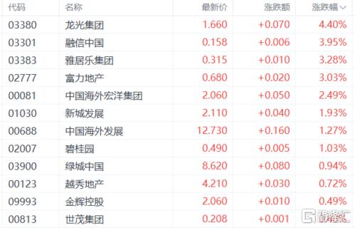 内房股上涨,龙光集团涨超4%,富力地产、中国海外宏洋集团、新城发展、中国海外发展、碧桂园、绿城中国等跟涨。