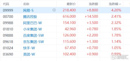 权重科技股集体上涨,网易涨超4%,腾讯控股、阿里巴巴涨超2%,小米集团、百度集团、京东集团、快手涨超1%,美团微涨。