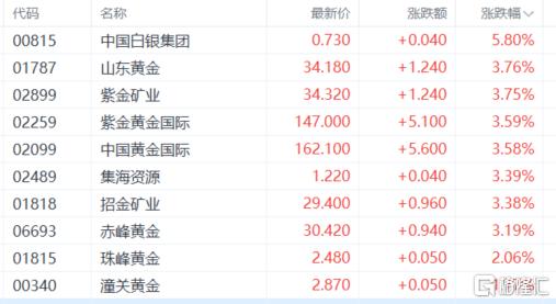 黄金股上扬,中国白银集团涨近6%,山东黄金、紫金矿业、紫金黄金国际、中国黄金国际、集海资源、招金矿业等跟涨。