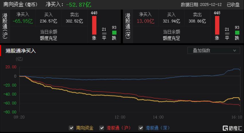 今日,南向资金净卖出52.87亿港元,其中港股通(沪)净卖出65.95亿港元,港股通(深)净买入13.09亿港元。
