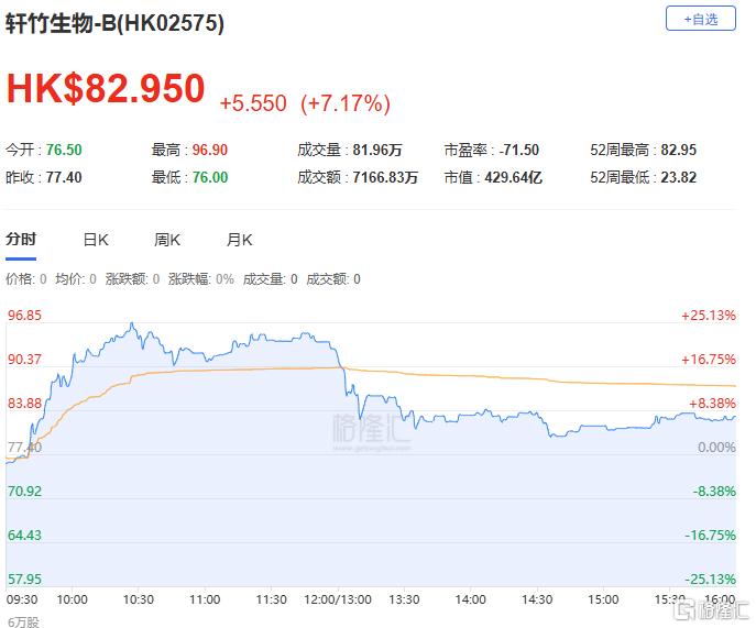 轩竹生物-B今日盘中大涨25.19%至96.9港元,股价创上市新高。截至收盘,该股股价涨超7%报82.95港元,市值近430亿港元。