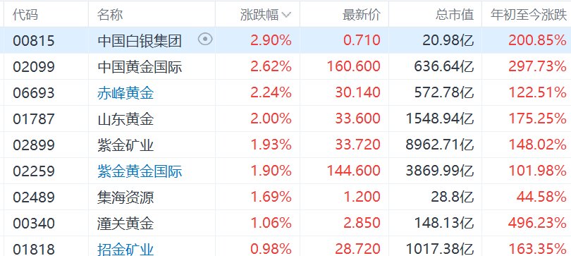 金银价格再度走强,刺激今日港股市场黄金股集体上涨。其中,中国白银集团、中国黄金国际、赤峰黄金、山东黄金涨超2%,紫金矿业、紫金黄金国际涨近2%。