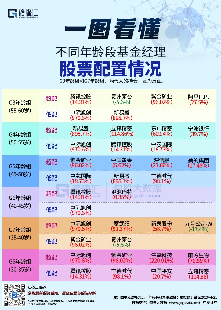 85后(G7组,35-40岁)的极致信仰:经历过新能源与AI牛市的他们,对硬科技变革红利深信不疑,显著超配中际旭创、寒武纪,低配紫金矿业与贵州茅台。