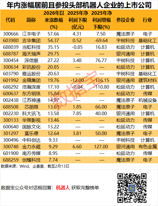另外,海天瑞声、深信服、彩讯股份2026年以来累计涨幅均超过25%,3家公司分别投资了银河通用、宇树科技、松延动力。