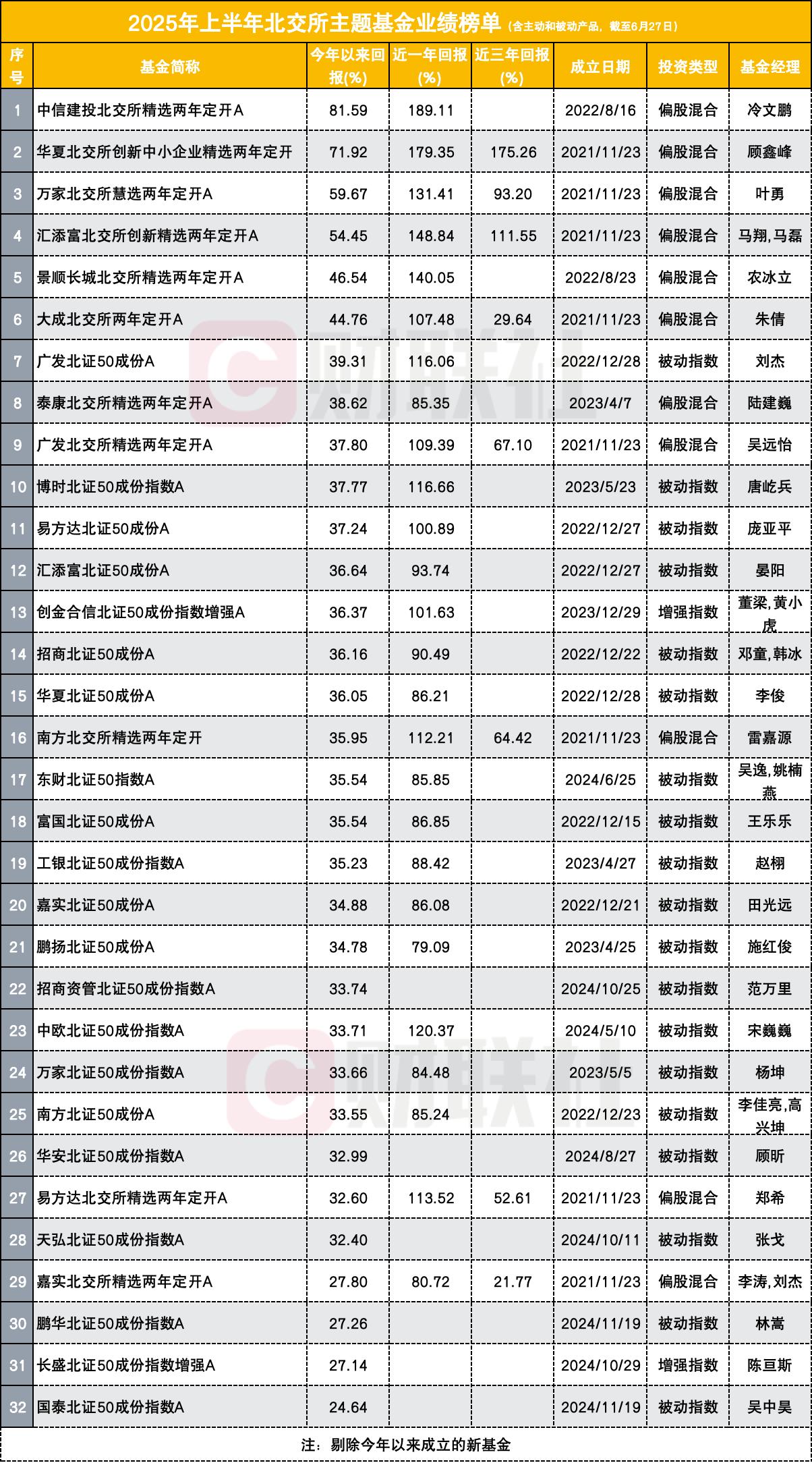 今年以来,主动权益基金表现不俗。据财联社记者统计,截至6月27日,主动权益基金平均净值增长率为5.89%,26只产品年内业绩超50%。其中,北交所主题基金大多有亮眼表现。