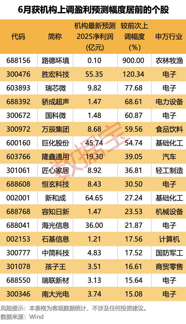 据证券时报·数据宝统计,截至6月26日,在机构前次预测(去年8月以后的预测)2025年净利润为正的个股中,剔除北交所个股后,有18股6月获机构最新预测净利润上调幅度均超15%,7股获上调幅度更是超50%。(注:被多家机构同时上调净利润预测的个股只保留调整幅度最大的样本)