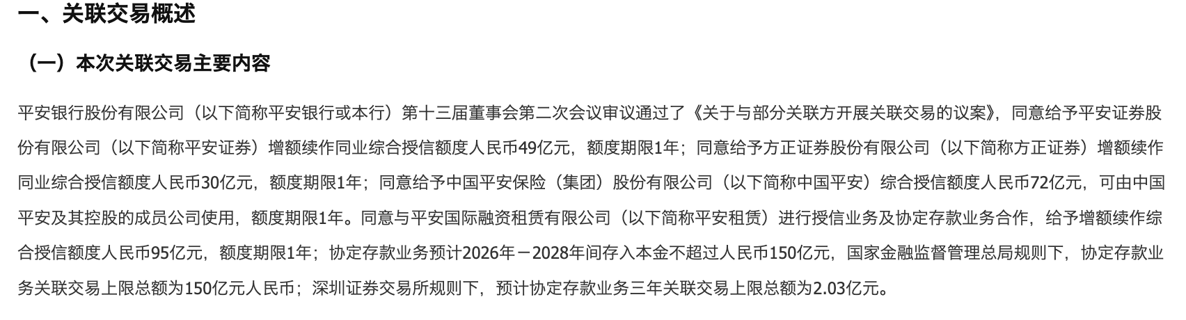 上证报中国证券网讯1月23日晚,平安银行公告称,该行第十三届董事会二次会议同意给予平安证券、方正证券、中国平安增额续作同业综合授信额度49亿元、30亿元、72亿元,期限均为1年;同意与平安租赁开展授信及协定存款业务合作,增额续作综合授信额度95亿元,期限1年;协定存款业务2026-2028年存入本金不超150亿元。