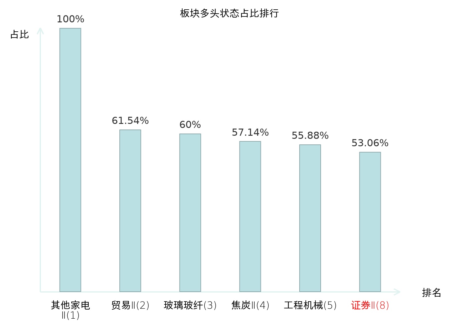全市场所有行业板块中主力多头状态占比排名中,其他家电Ⅱ板块位居第一。航海装备Ⅱ板块名次提升最快,较昨日上升98位。