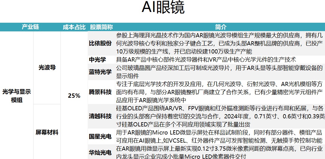 据财联社VIP盘中宝•数据栏目此前梳理,在AI眼镜产业链中,光学与显示模组领域成本占比25%,涉及上市公司包括比依股份、中光学、蓝特光学、腾景科技、清越科技、国星光电和华灿光电,具体情况详见下图: