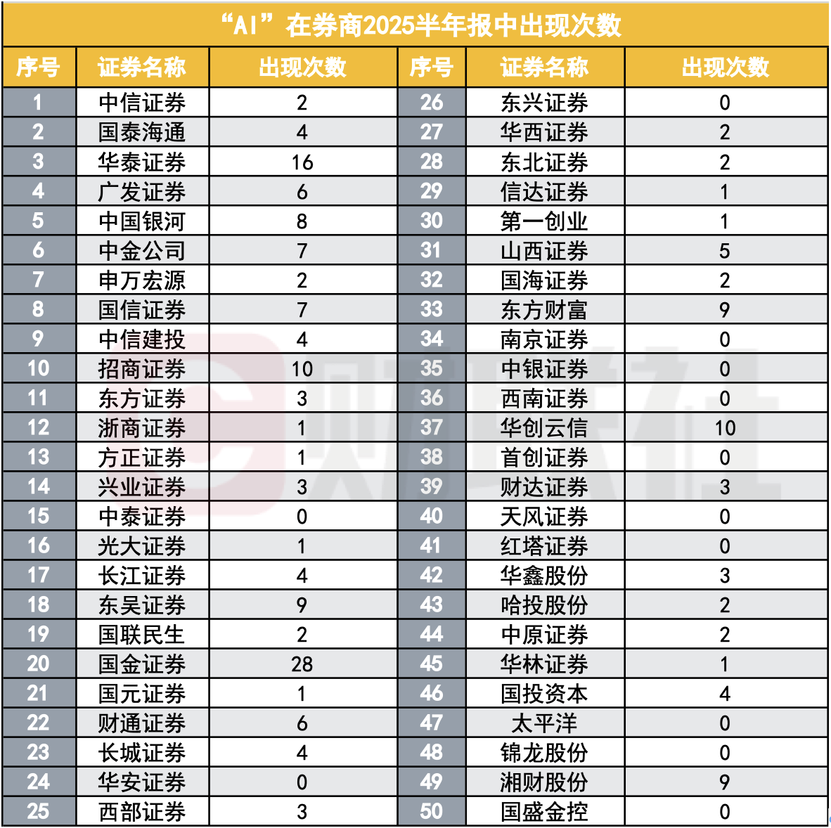 招商证券、华创证券分别提及“AI”10次,东吴证券、东方财富、湘财证券分别提及9次,中国银河、中金公司、国信证券、广发证券、财通证券、山西证券均提及5次及以上,而东兴证券、南京证券、中银证券等12家券商在半年报中未提及“AI”相关内容。