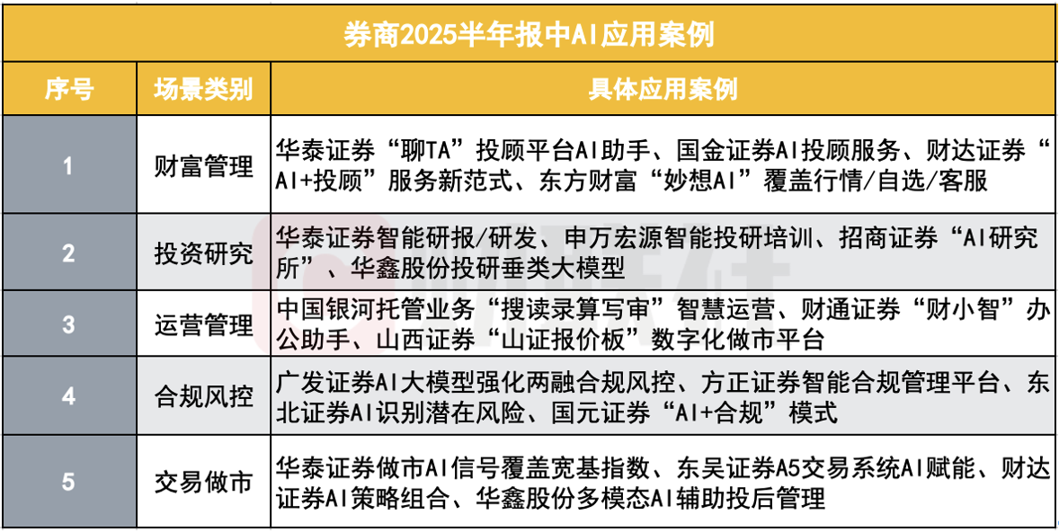 综合来看半年报中各券商AI应用已全面渗透至券商全业务领域,其中财富管理与投研领域的应用最为成熟,成为行业差异化竞争的关键抓手。