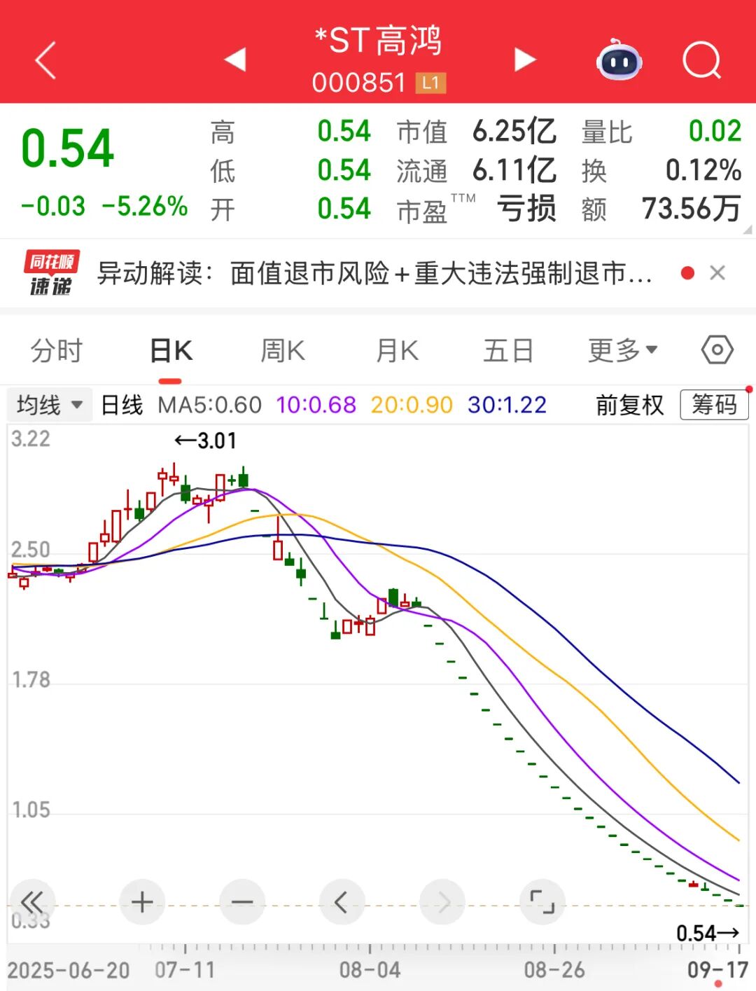 *ST高鸿是目前A股市场最低价的个股,昨日收盘价为0.57元/股,最新收盘价为0.54元/股,再度创出历史新低。