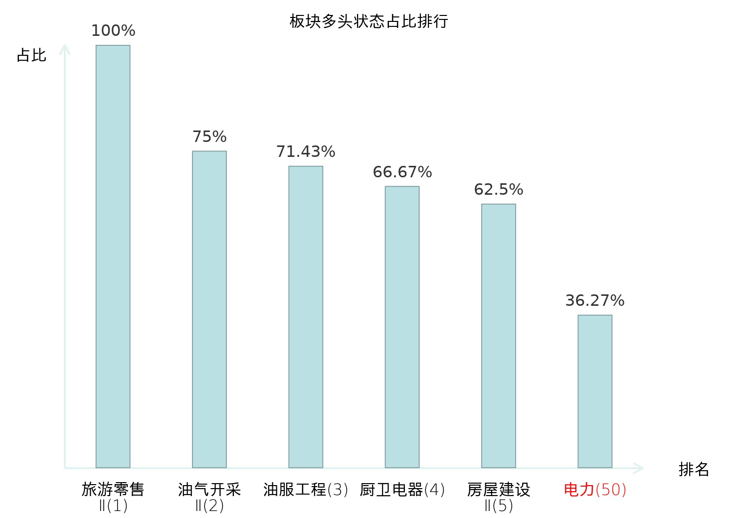 全市场所有行业板块中主力多头状态占比排名中,旅游零售Ⅱ板块位居第一。焦炭Ⅱ板块名次提升最快,较昨日上升58位。