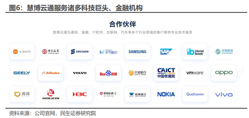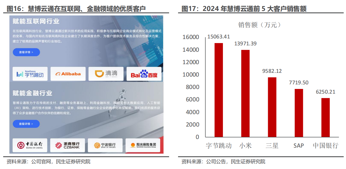慧博云通:拥有优质的互联网巨头、大型金融机构客户资源。慧博云通早年服务于TMT巨头起家,逐步拓展互联网、金融领域客户。在互联网领域公司主要客户包括字节、阿里两大巨头,同时近年来发力拓展金融机构客户,覆盖中国银行、浙商银行、宁波银行等头部机构。根据2024年年报数据,公司前5大客户分别为字节、小米、三星、SAP、中国银行,其中字节、小米销售额占总体营收比分别为9%、8%。手握优质客户资源,是慧博云通的核心优势之一。