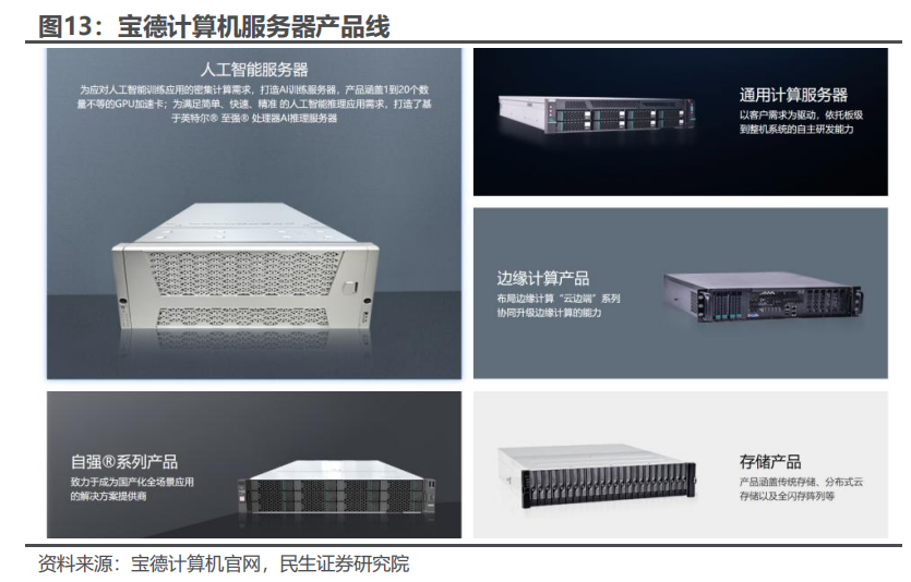 宝德计算机:国产算力龙头,全栈布局AI算力基础设施。宝德计算机系统股份有限公司是中国领先的计算产品方案提供商,以服务器和PC整机的研发、生产、销售及提供相关的综合解决方案为主营业务。从产品定位上看,宝德以国产芯片(尤其是AI新品)为基础,产品线覆盖通用、AI、自强系列、存储、液冷服务器等全栈产品线。