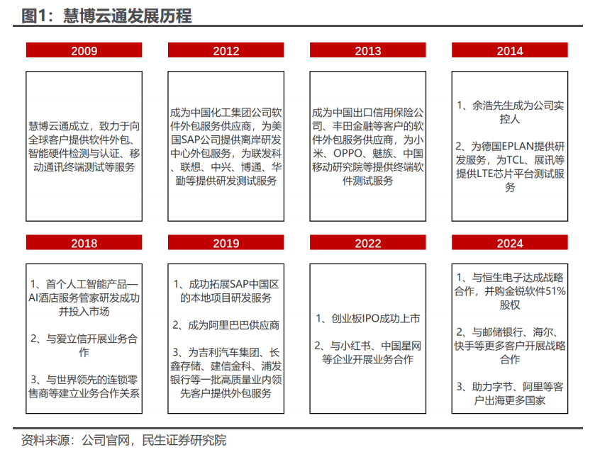 慧博云通成立于2009年,主要为全球客户提供软件外包+终端测试服务,公司早年主要为通信行业科技企业服务,随着多年发展逐渐覆盖互联网、金融、汽车等行业。公司自2022年上市后通过收购的方式加速拓展金融IT领域的客户,同时持续加强与互联网大厂的合作。