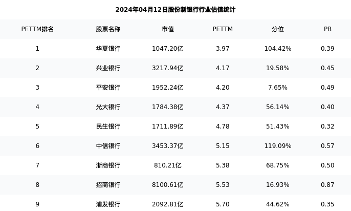 从估值角度看:浙商银行最新市盈率PETTM为5.38,在行业内排名7/9,处于68.75分位。
