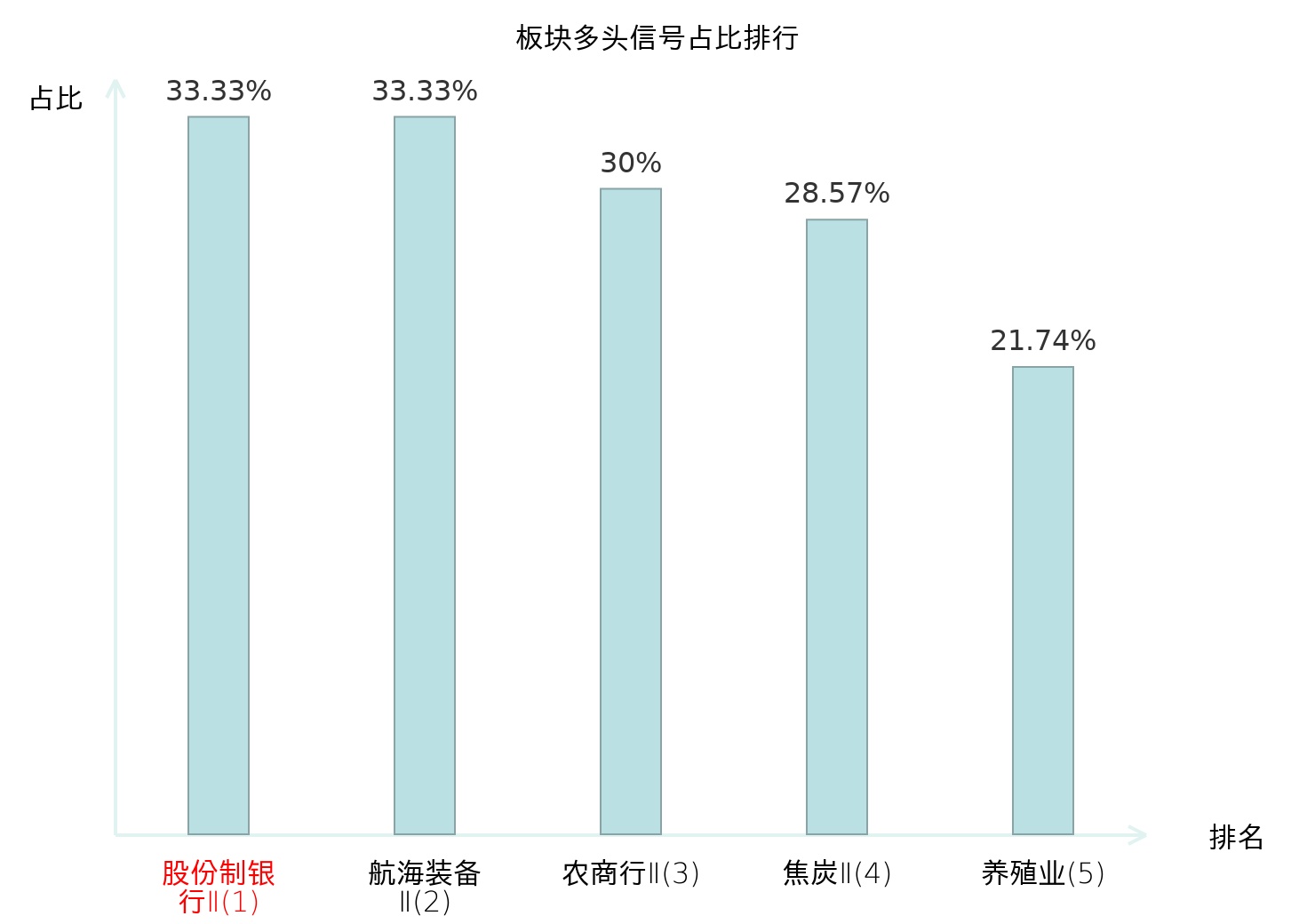 全市场所有行业板块中主力多头信号占比排名中,股份制银行Ⅱ板块位居第一。焦炭Ⅱ板块名次提升最快,较昨日上升119位。