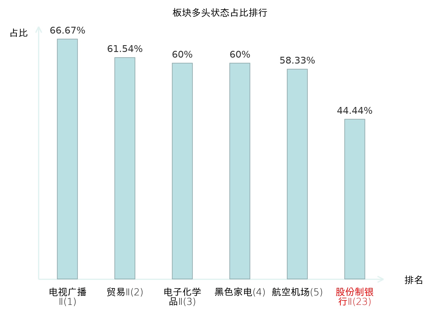 全市场所有行业板块中主力多头状态占比排名中,电视广播Ⅱ板块位居第一。黑色家电板块名次提升最快,较昨日上升80位。