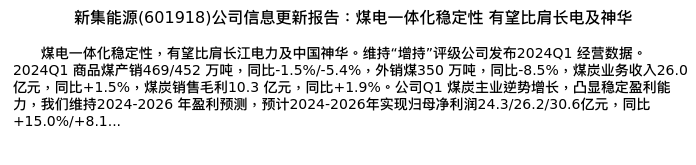 值得注意的是:2024年04月开源证券的张绪成分析师,首次发布关于新集能源的研究报告,标题为:新集能源(601918)公司信息更新报告:煤电一体化稳定性 有望比肩长电及神华。