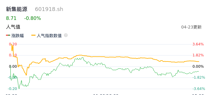 04月23日,新集能源收报8.71,股价涨幅-0.80%,成交金额3.43亿元,换手率1.53%。