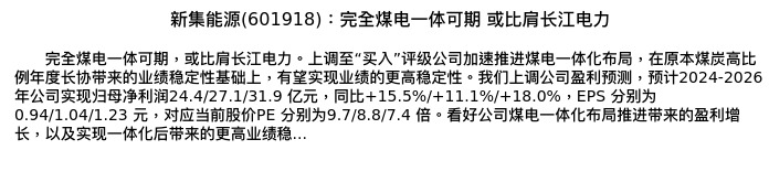 值得注意的是:2024年04月开源证券的张绪成分析师,首次发布关于新集能源的研究报告,标题为:新集能源(601918):完全煤电一体可期 或比肩长江电力。
