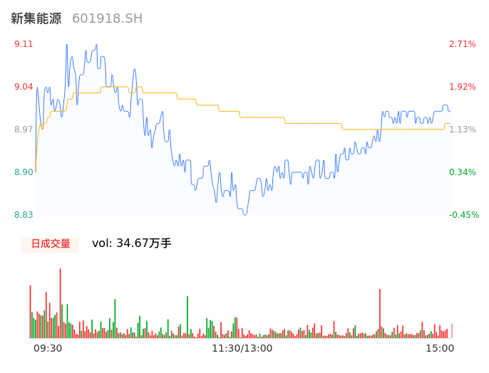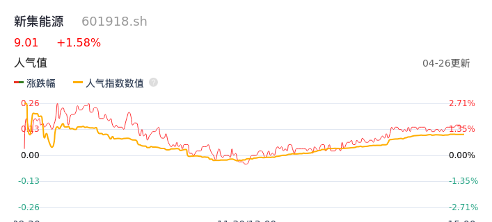 04月26日,新集能源收报9.01,股价涨幅1.58%,成交金额3.11亿元,换手率1.34%。