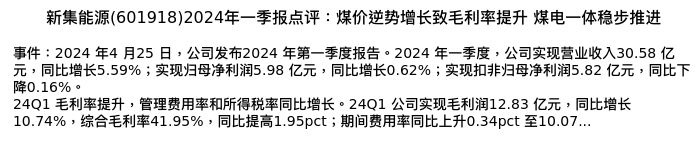 值得注意的是:2024年04月民生证券的周泰/李航/王姗姗分析师,首次发布关于新集能源的研究报告,标题为:新集能源(601918)2024年一季报点评:煤价逆势增长致毛利率提升 煤电一体稳步推进。