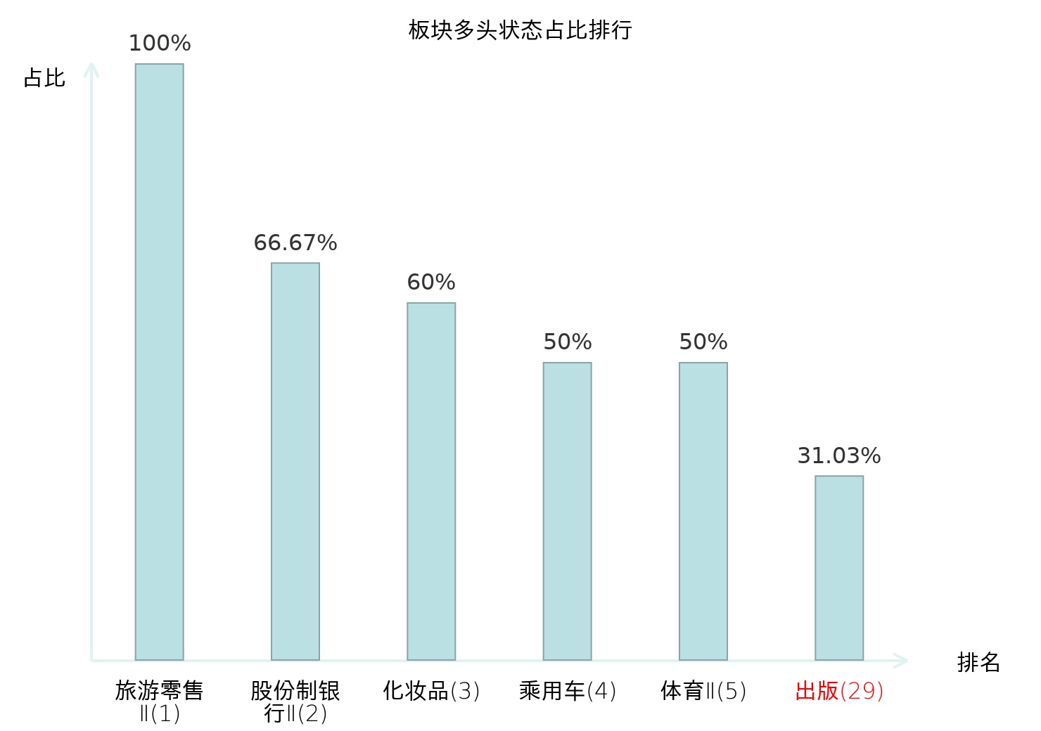 全市场所有行业板块中主力多头状态占比排名中,旅游零售Ⅱ板块位居第一。旅游零售Ⅱ板块名次提升最快,较昨日上升130位。