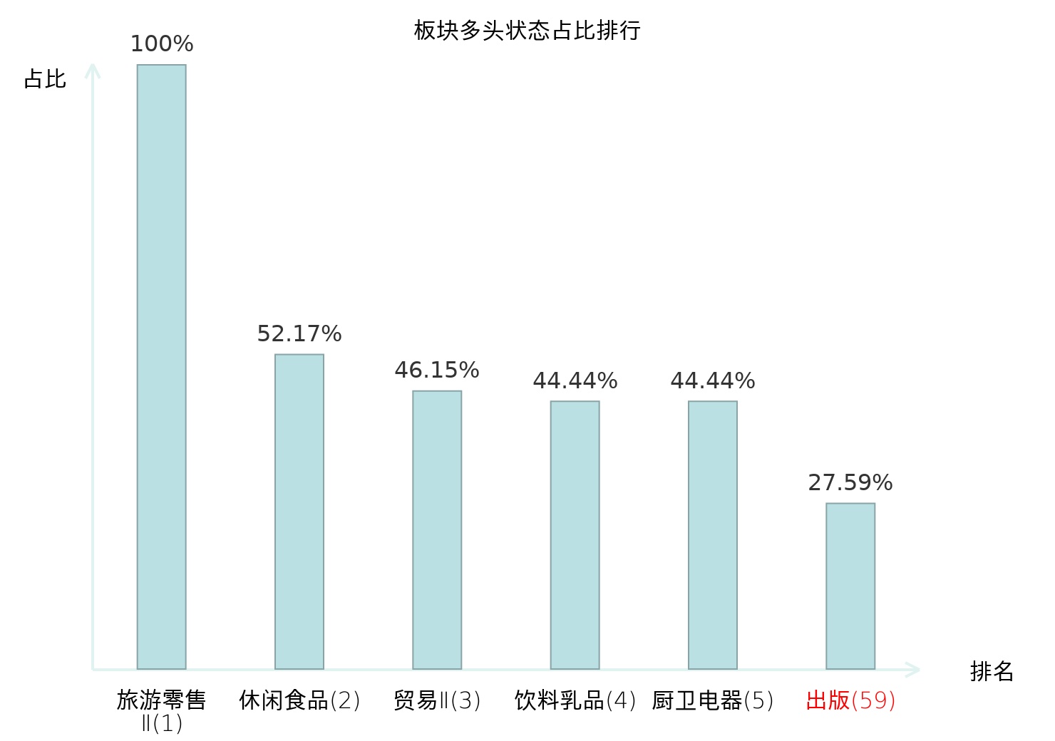全市场所有行业板块中主力多头状态占比排名中,旅游零售Ⅱ板块位居第一。乘用车板块名次提升最快,较昨日上升91位。