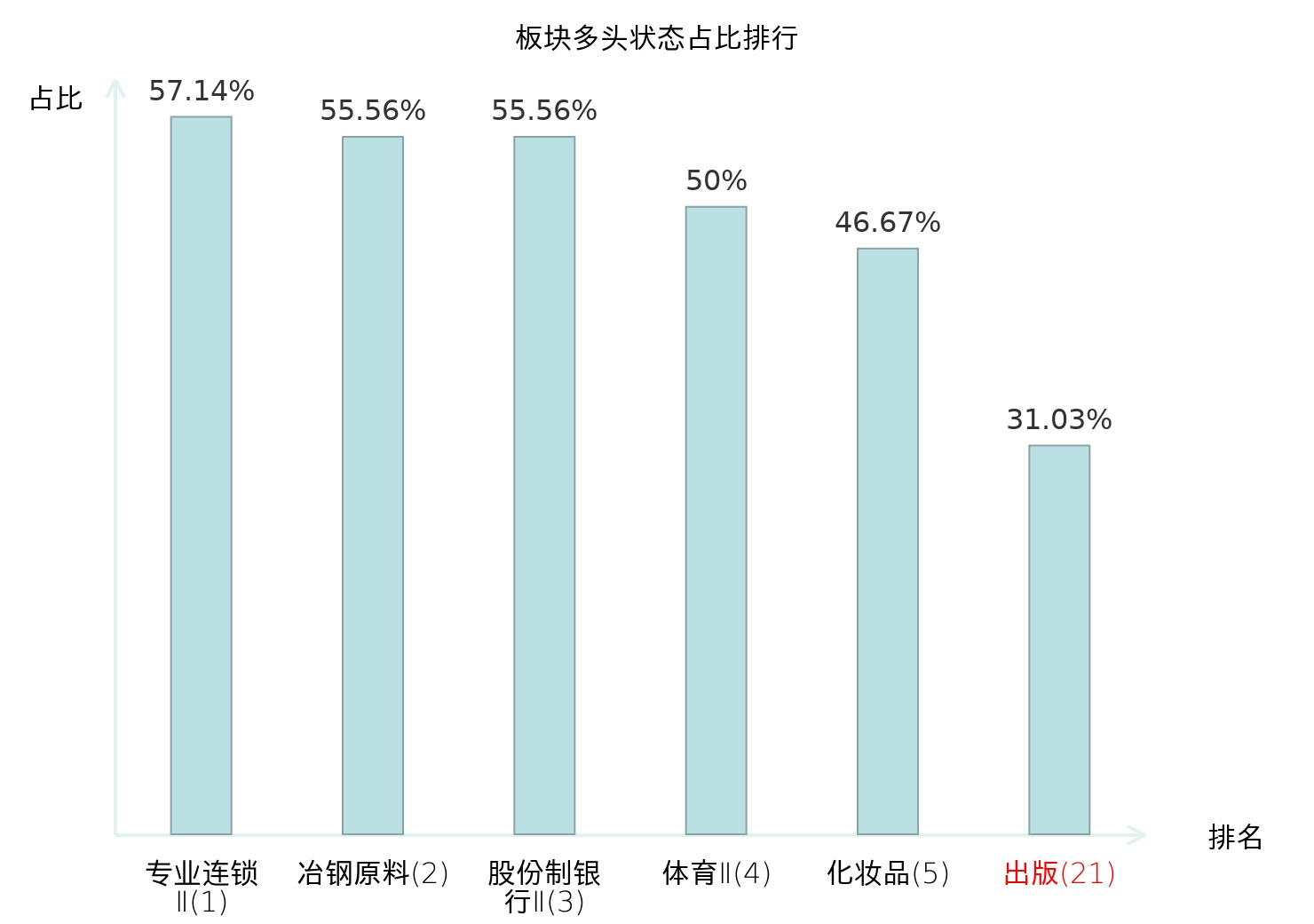 全市场所有行业板块中主力多头状态占比排名中,专业连锁Ⅱ板块位居第一。乘用车板块名次提升最快,较昨日上升85位。