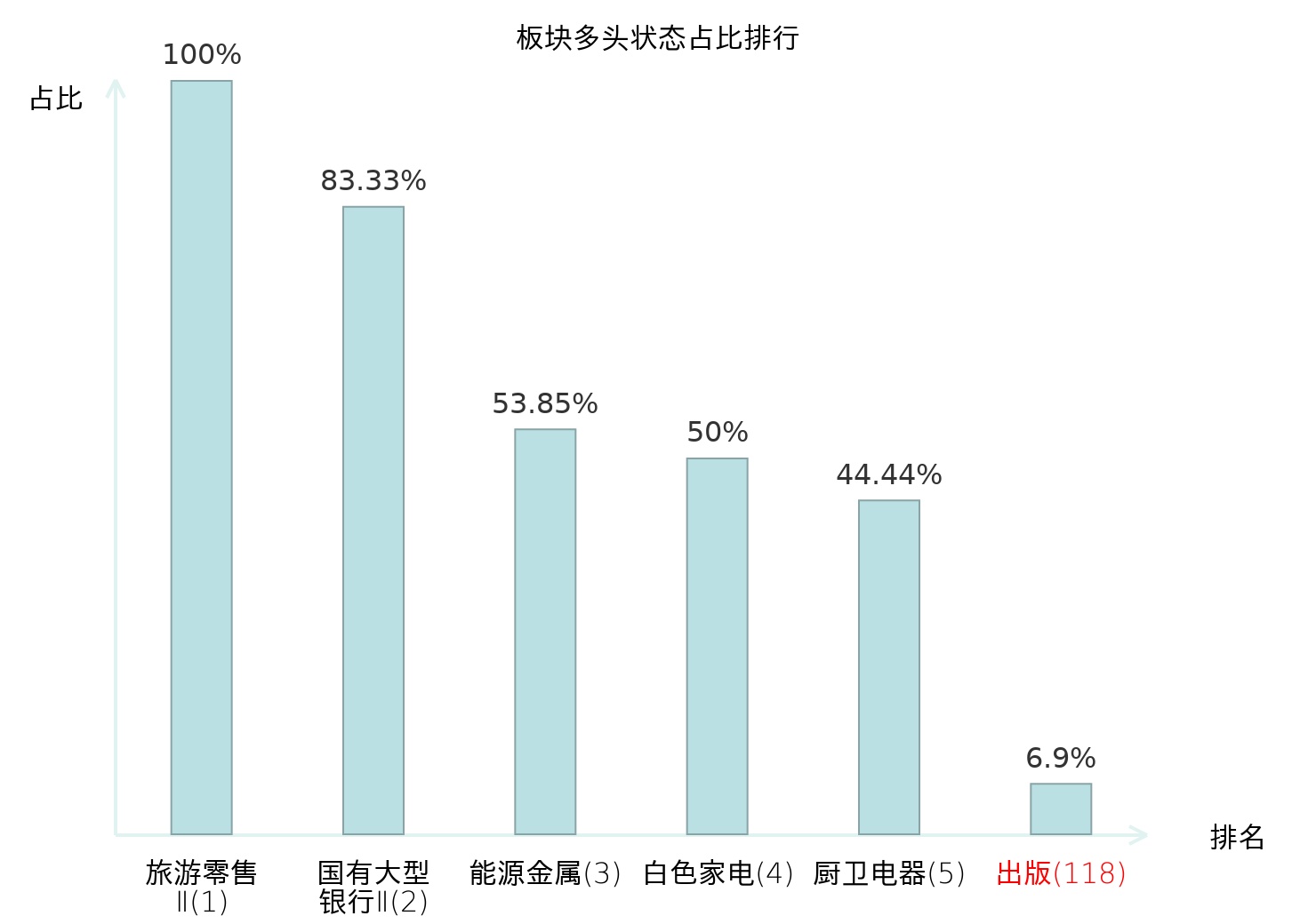全市场所有行业板块中主力多头状态占比排名中,旅游零售Ⅱ板块位居第一。地面兵装Ⅱ板块名次提升最快,较昨日上升71位。