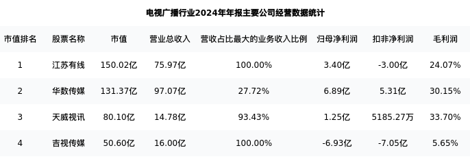 吉视传媒最新报告期数据为年报,下表汇总了电视广播行业内市值靠前的公司年报主要经营数据