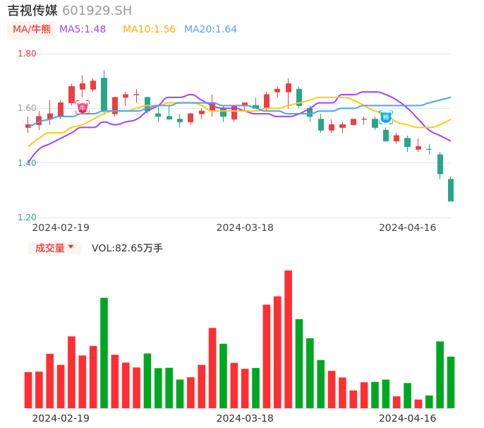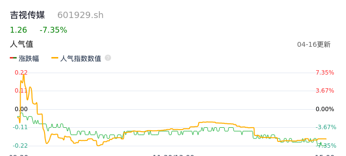 04月16日,吉视传媒收报1.26,股价涨幅-7.35%,成交金额1.08亿元,换手率2.37%。