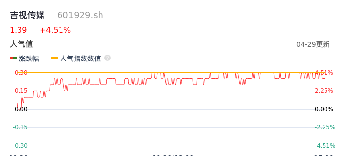 04月29日,吉视传媒收报1.39,股价涨幅4.51%,成交金额9310.34万元,换手率1.95%。