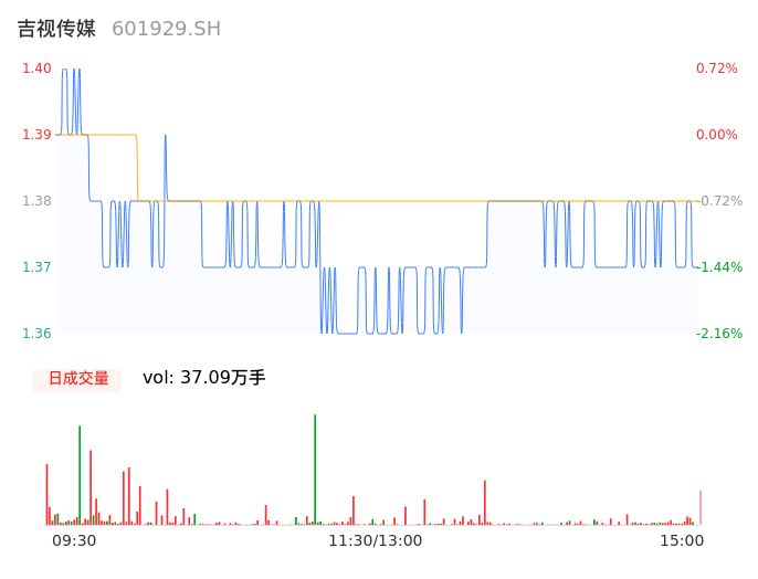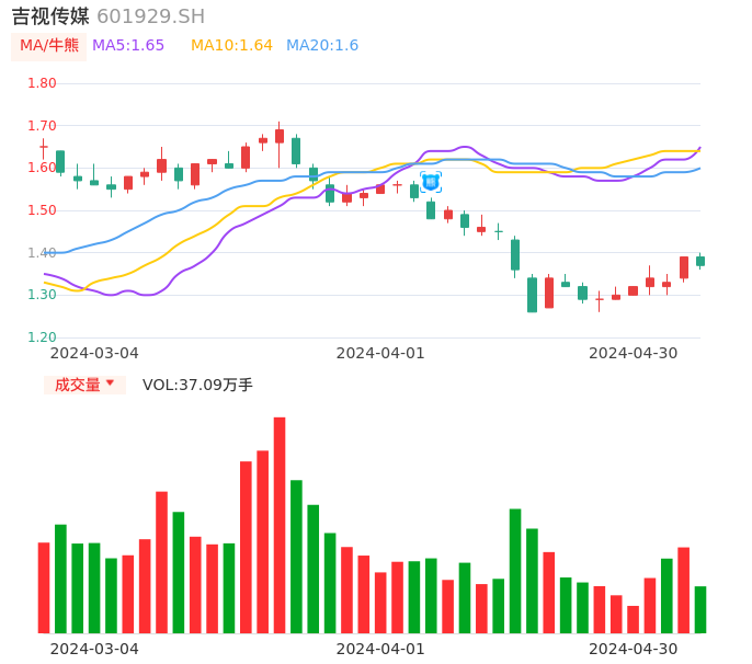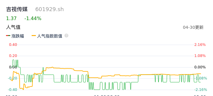 04月30日,吉视传媒收报1.37,股价涨幅-1.44%,成交金额5108.22万元,换手率1.06%。