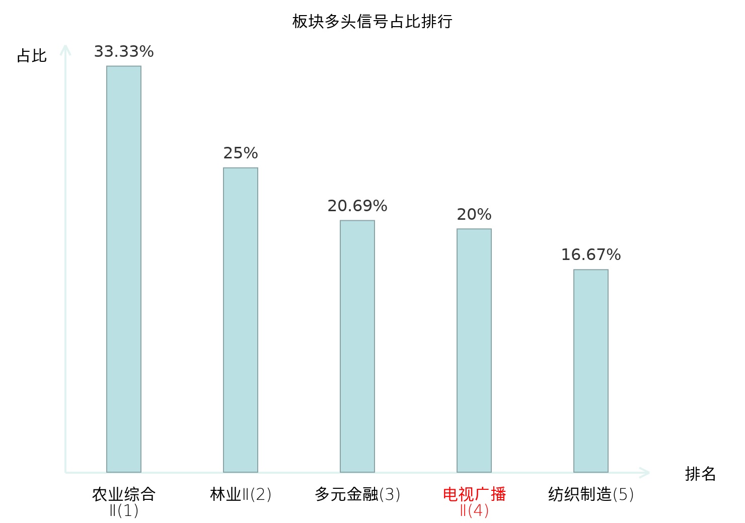 全市场所有行业板块中主力多头信号占比排名中,农业综合Ⅱ板块位居第一。农业综合Ⅱ板块名次提升最快,较昨日上升127位。