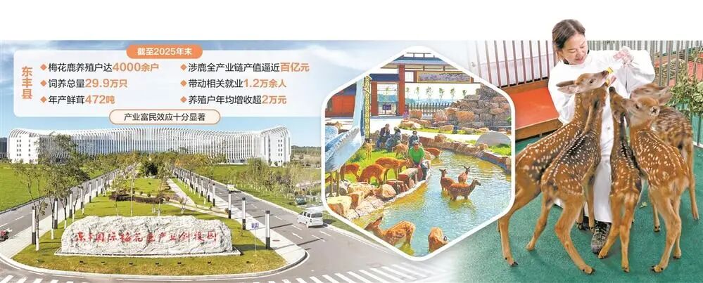 据了解,东丰县出产的梅花鹿种源纯正,鹿茸品质享誉业内,是中医药界公认的“关药”明星品种。截至2025年末,当地梅花鹿养殖户达4000余户,饲养总量29.9万只,年产鲜茸472吨,涉鹿全产业链产值逼近百亿元,带动相关就业1.2万余人,养殖户年均增收超2万元,产业富民效应十分显著。