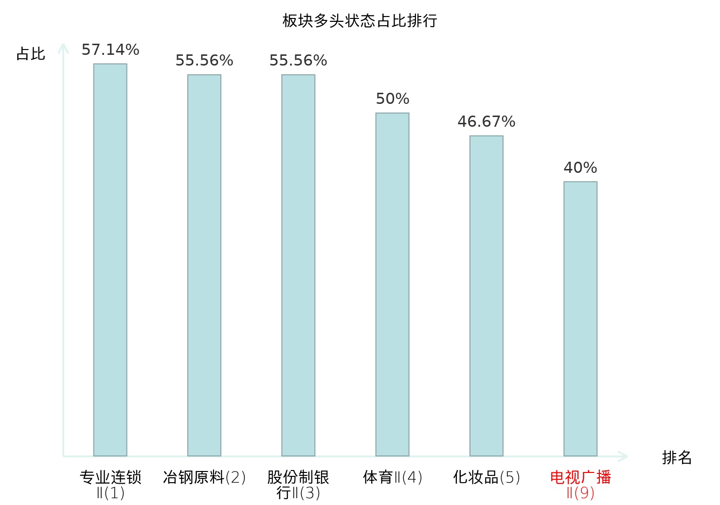 全市场所有行业板块中主力多头状态占比排名中,专业连锁Ⅱ板块位居第一。乘用车板块名次提升最快,较昨日上升85位。
