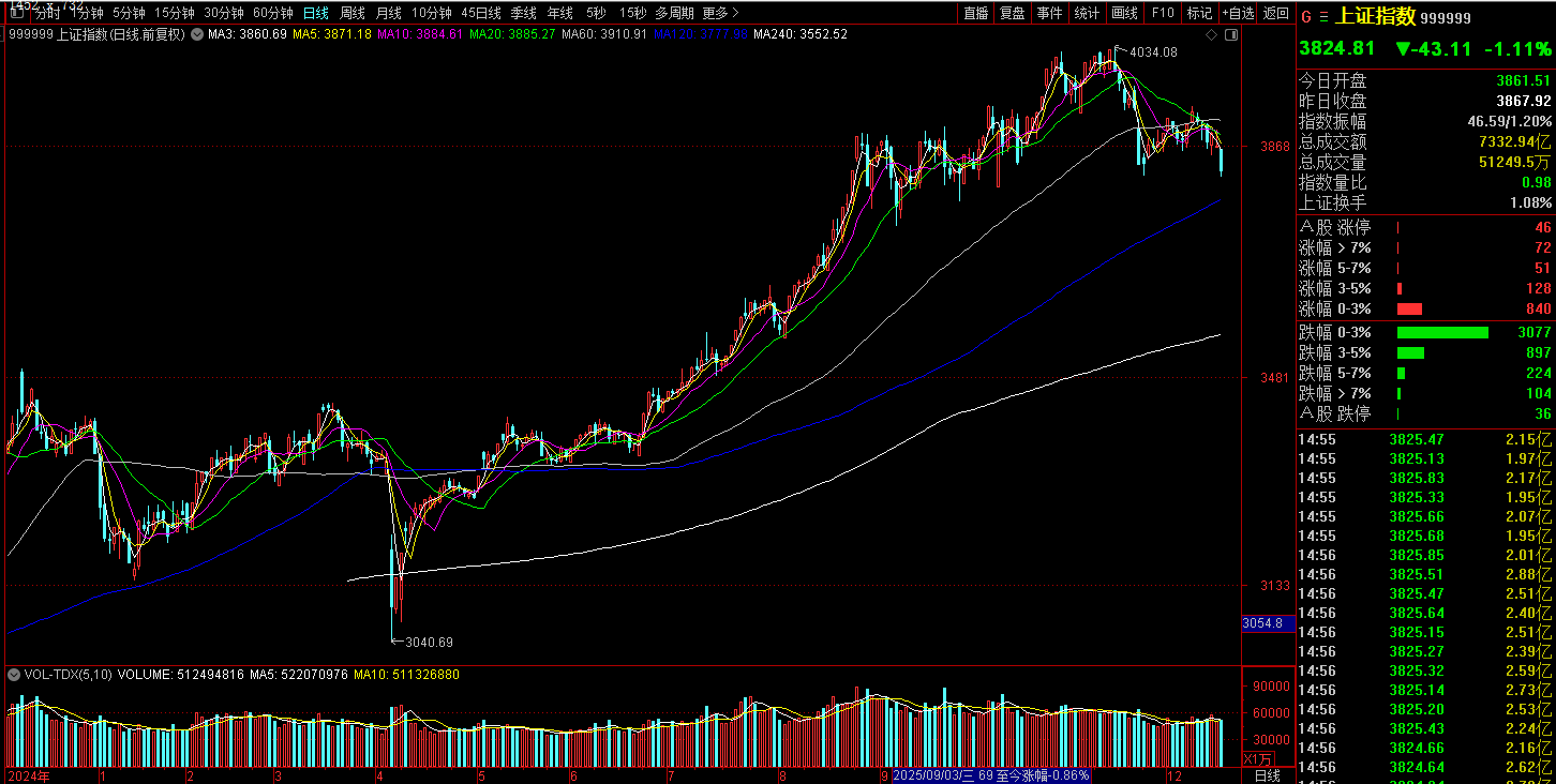 三大指数延续调整,其中沪指跌1.11%,深成指跌1.51%,创业板指跌2.10%。总体个股跌多涨少,下跌家数为4302家,涨停家数(排除ST)为40家,跌停家数(排除ST)为15家,市场情绪陷入冰点。两市成交额总计1.72万亿,较昨日缩量493亿,成交量相对稳定