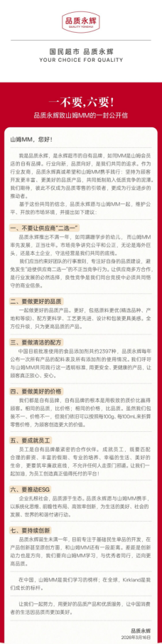 信中重点呼吁山姆MM不要让供应商“二选一”,坚决反对不正当竞争行为,应当约束好团队的行事准则,专注好自身的品质建设。
