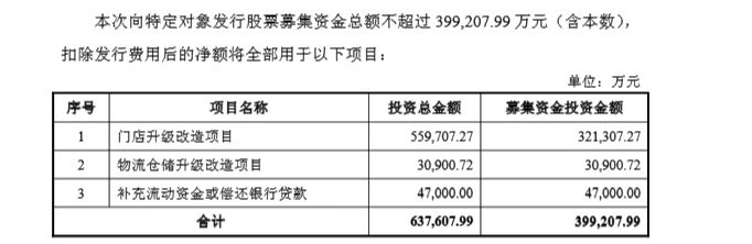 此次募集资金中,有4.7亿元用于补充流动资金或偿还银行贷款。对此,公司称,近年来,由于公司持续亏损且门店调改等事项使得公司的运营资金需求有所上升,从而导致公司整体负债规模较大,资产负债率较高。截至2025年3月31日,公司负债总额为349.00亿元,资产负债率为88.73%。公司目前正处于战略和经营转型的关键阶段,对资金具有较高的需求。