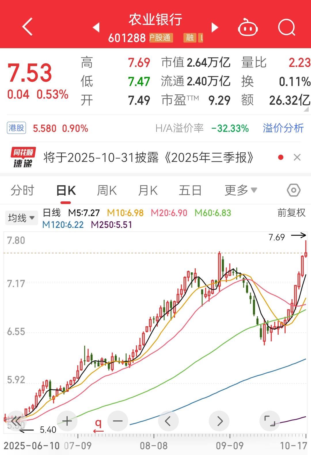 银行指数早盘一度涨超1%,农业银行、建设银行、交通银行等飘红。表现最突出的是农业银行(601288),该股早盘一度涨超2.6%,股价再创历史新高,其A股市值一度飙升至2.45万亿元。