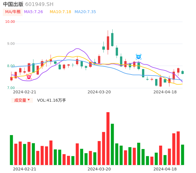 04月18日,中国出版收报7.64,股价涨幅-3.17%,成交金额3.17亿元,换手率2.26%。