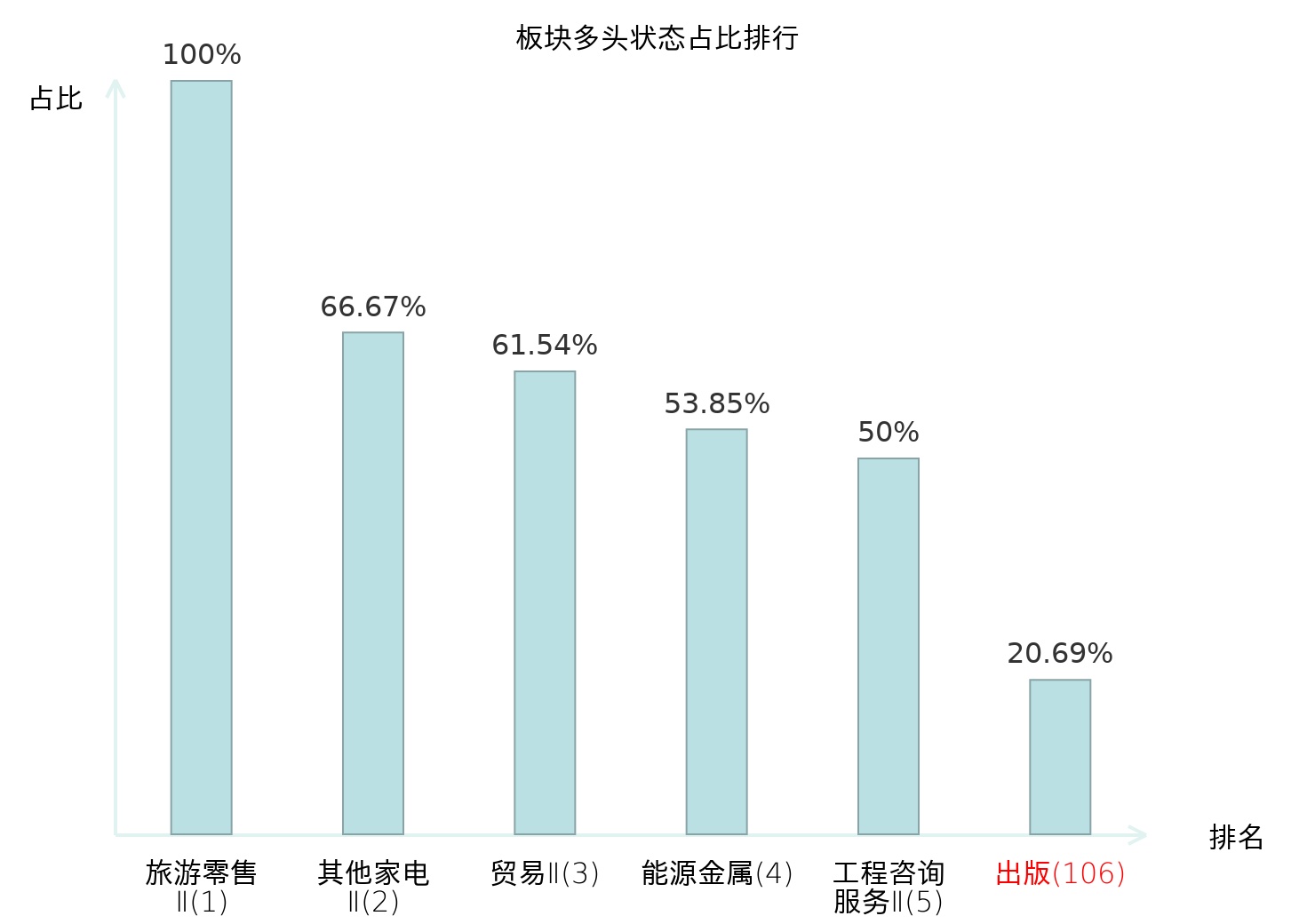 全市场所有行业板块中主力多头状态占比排名中,旅游零售Ⅱ板块位居第一。冶钢原料板块名次提升最快,较昨日上升37位。