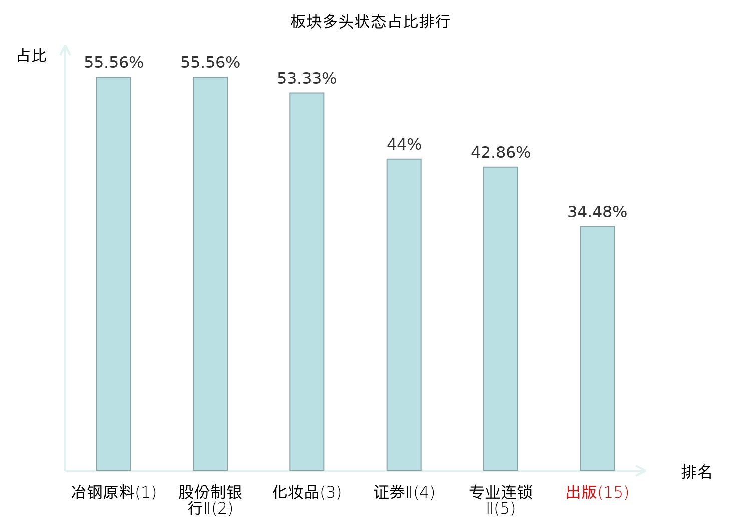 全市场所有行业板块中主力多头状态占比排名中,冶钢原料板块位居第一。保险Ⅱ板块名次提升最快,较昨日上升114位。