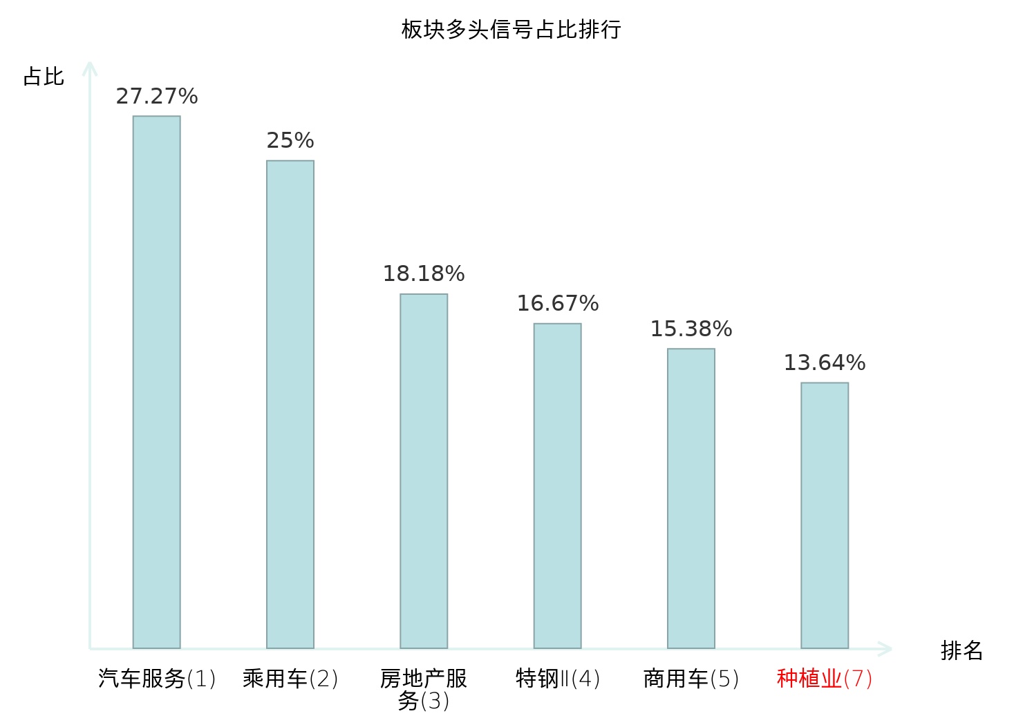 全市场所有行业板块中主力多头信号占比排名中,汽车服务板块位居第一。乘用车板块名次提升最快,较昨日上升117位。