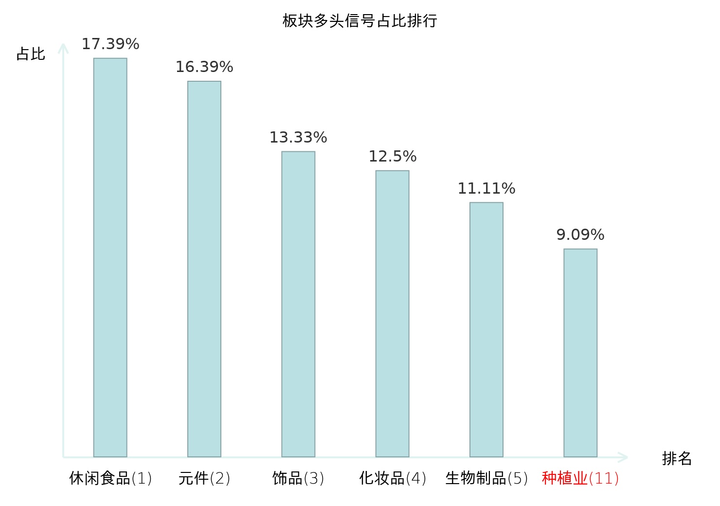 全市场所有行业板块中主力多头信号占比排名中,休闲食品板块位居第一。厨卫电器板块名次提升最快,较昨日上升108位。