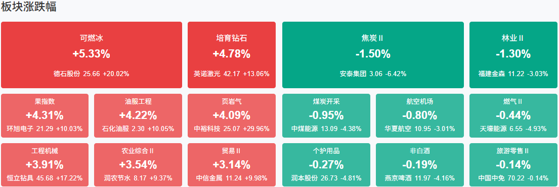 板块方面,培育钻石、CPO、工程机械等板块涨幅居前,煤炭等板块跌幅居前。截至收盘,沪指涨1.2%,深成指涨1.97%,创业板指涨2.92%。