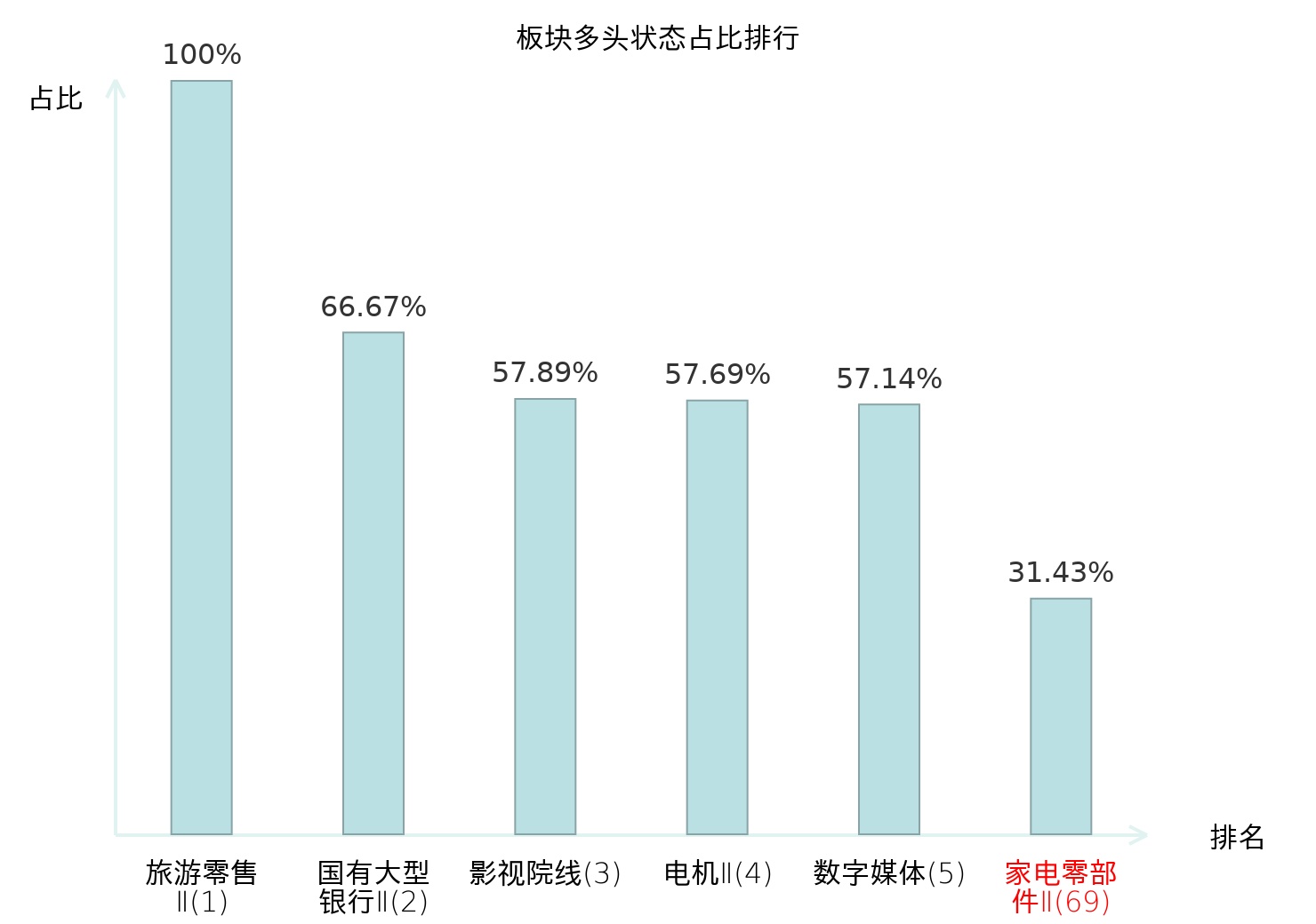 全市场所有行业板块中主力多头状态占比排名中,旅游零售Ⅱ板块位居第一。专业连锁Ⅱ板块名次提升最快,较昨日上升56位。